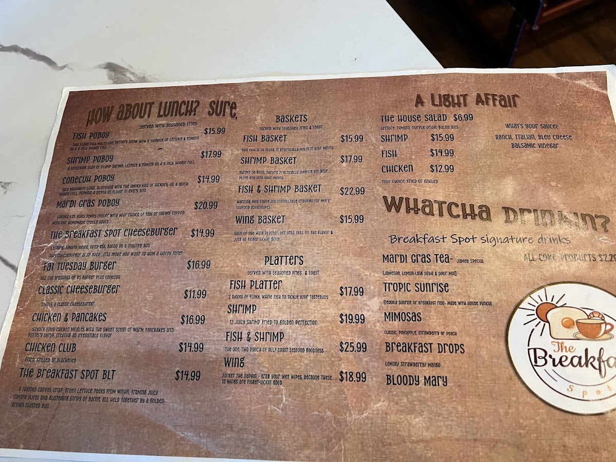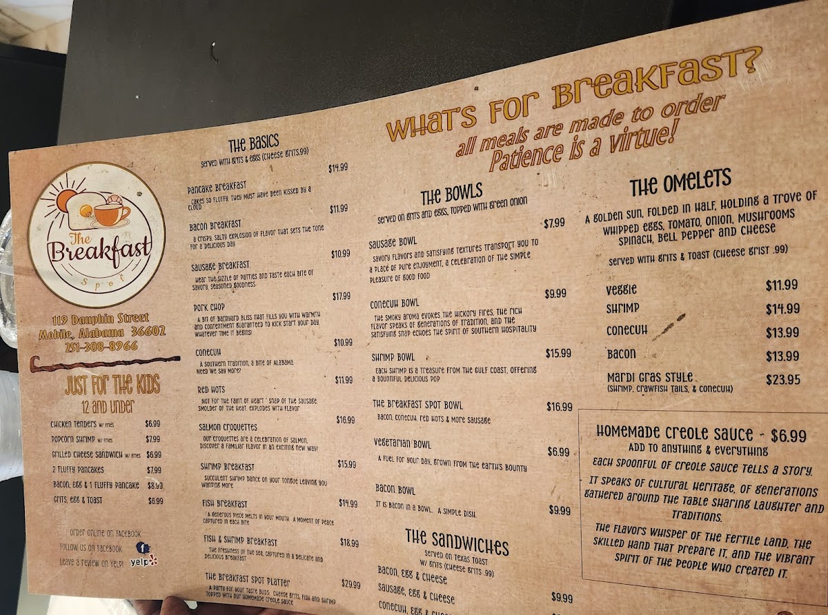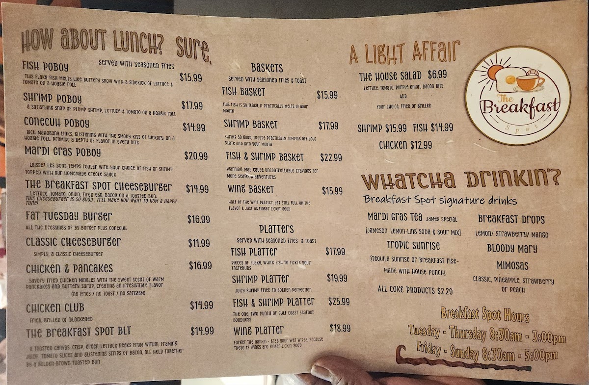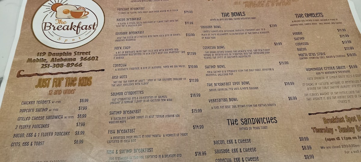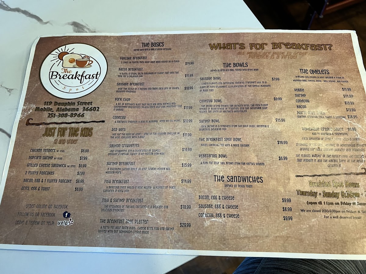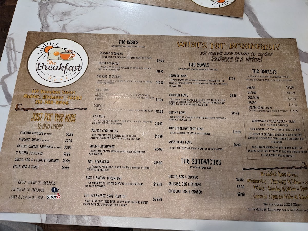 The Breakfast Spot offers a welcoming, casual café menu filled with comforting breakfast and brunch favorites. Whether you're stopping by to fuel up for the day or settling in for a leisurely weekend morning, their menu brings Southern-inspired dishes and simple classics together in a relaxed atmosphere.
